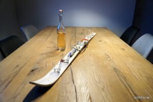Gerne nehmen wir auch eine Beschichtung für diesen schönen Ski vor. Mit der hochwertigen Lasur ist der Ski für den Außenbereich geeignet. Zudem kommen die Konturen und Maserungen vom Holz noch besser zur Geltung.