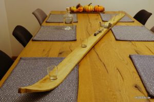 Dieses Modell bietet Platz für fünf Gläser und hat eine Länge von 195 cm. Der Abstand zwischen den Gläsern ist so gewählt, dass alle gemütlich trinken können.