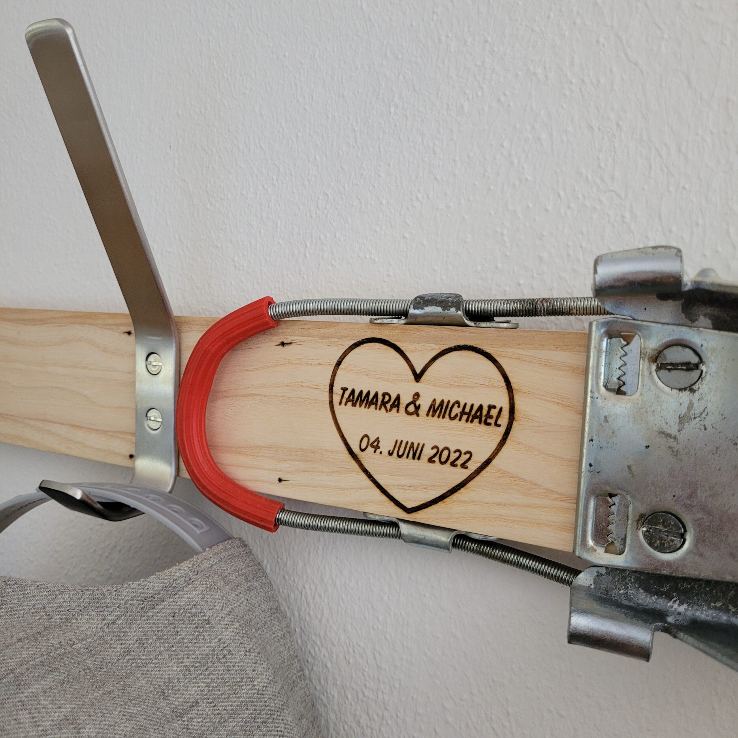 Was gibts schöneres, als etwas individuelles zu schenken? Folglich bieten wir an, den Namen des Brautpaars in ein Herz zu lasern. Optional können wir auch noch das entsprechende Datum ergänzen. Auch die Geschenkten sollen namentlich erwähnt werden? Das ergänzen wir gerne ohne Aufpreis auf der Rückseite des Ski’s. Das perfekte Hochzeitsgeschenk für ein Ski-begeistertes Brautpaar!